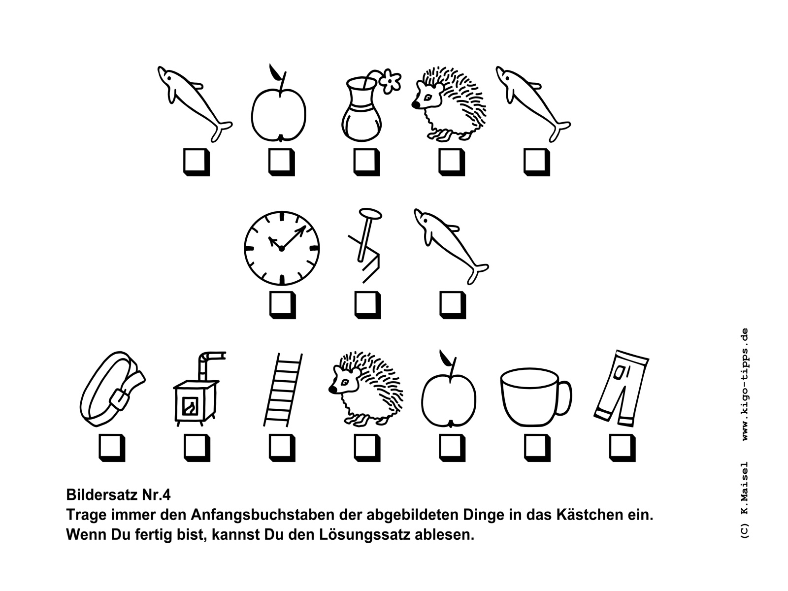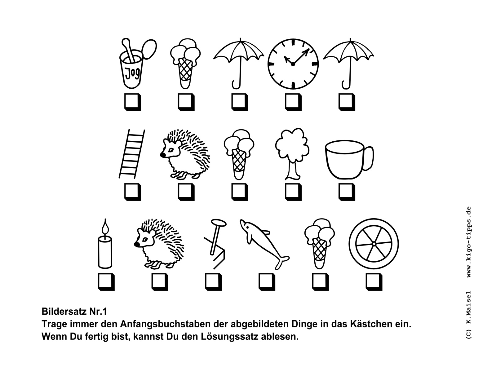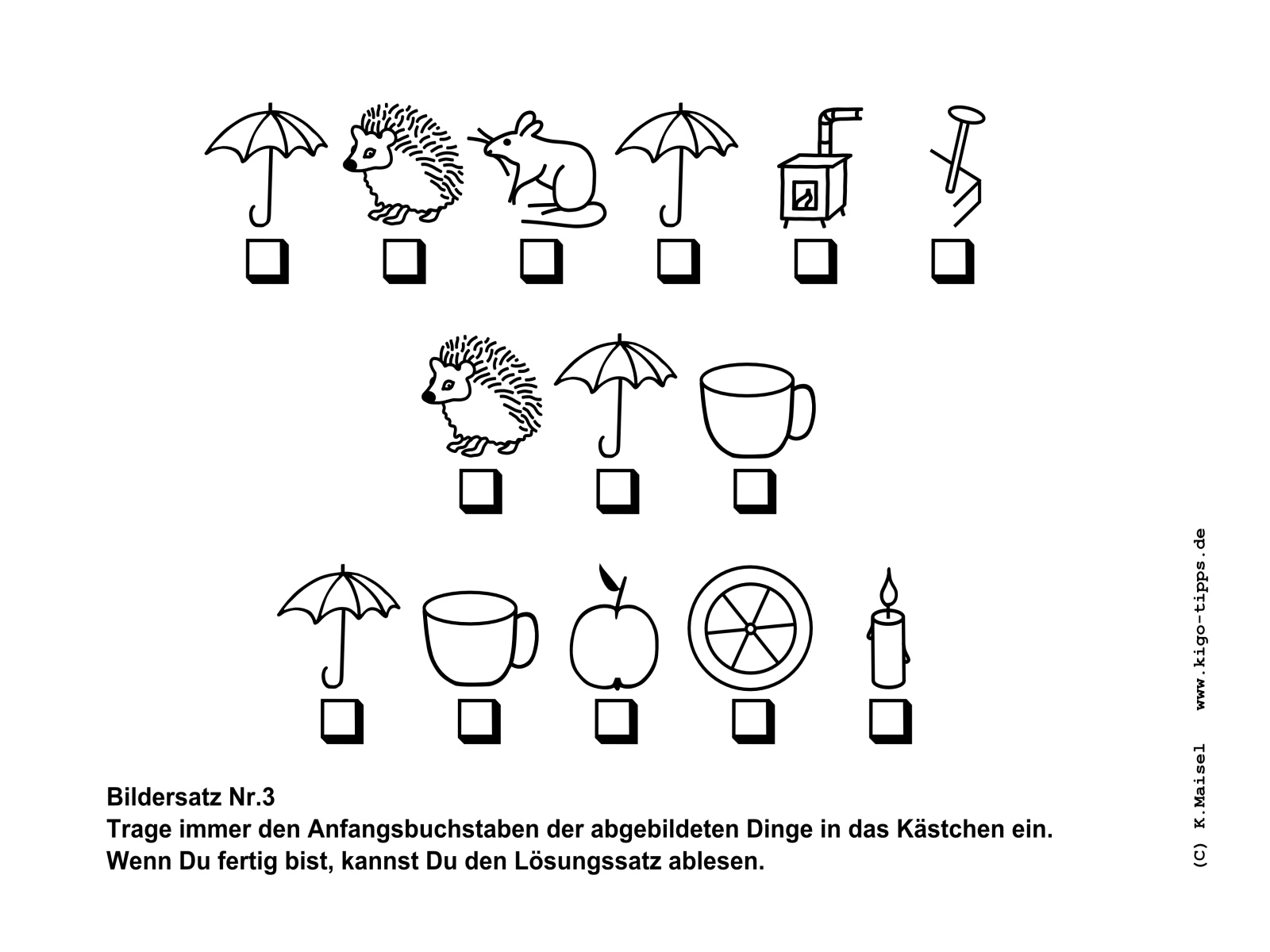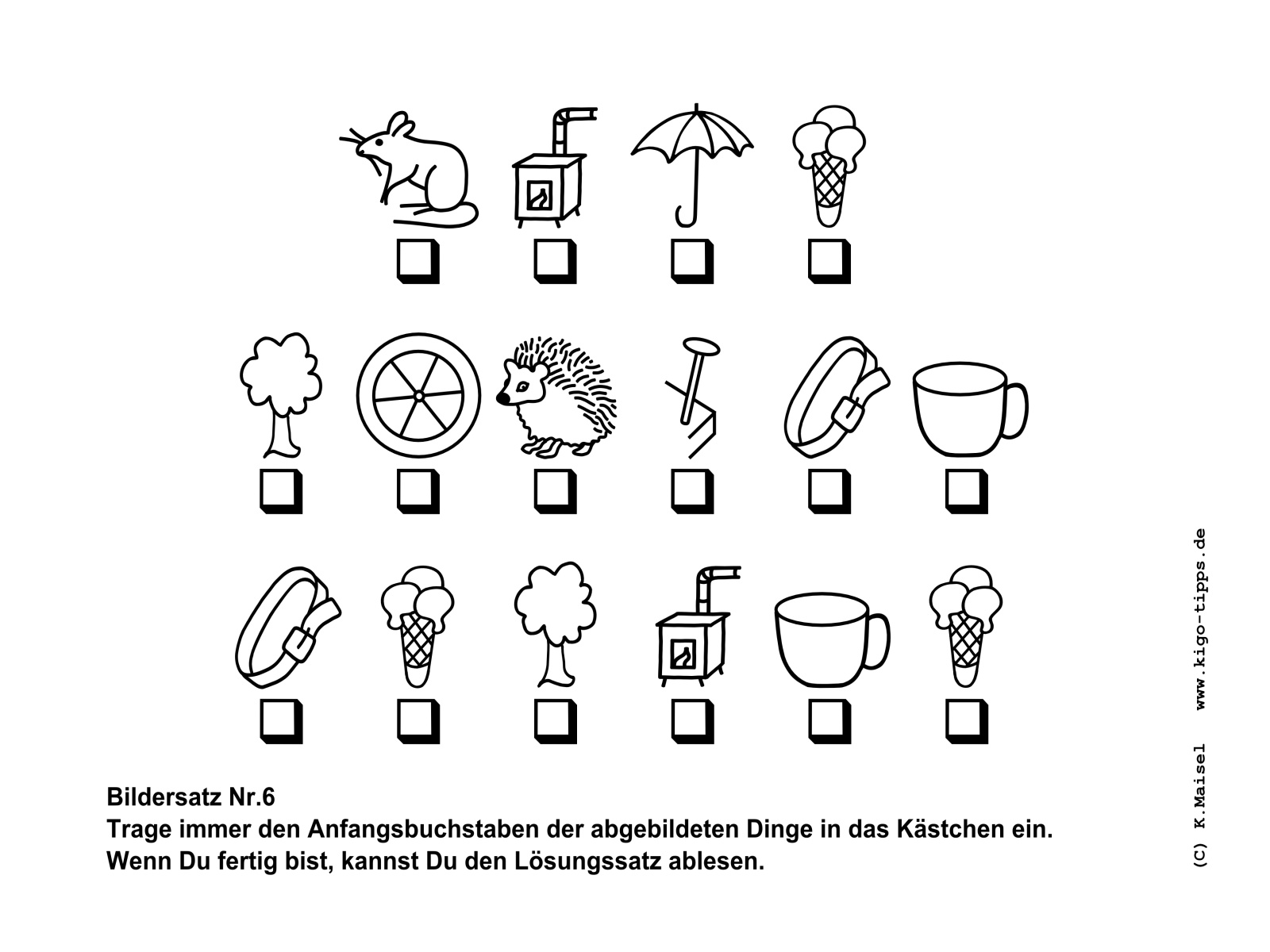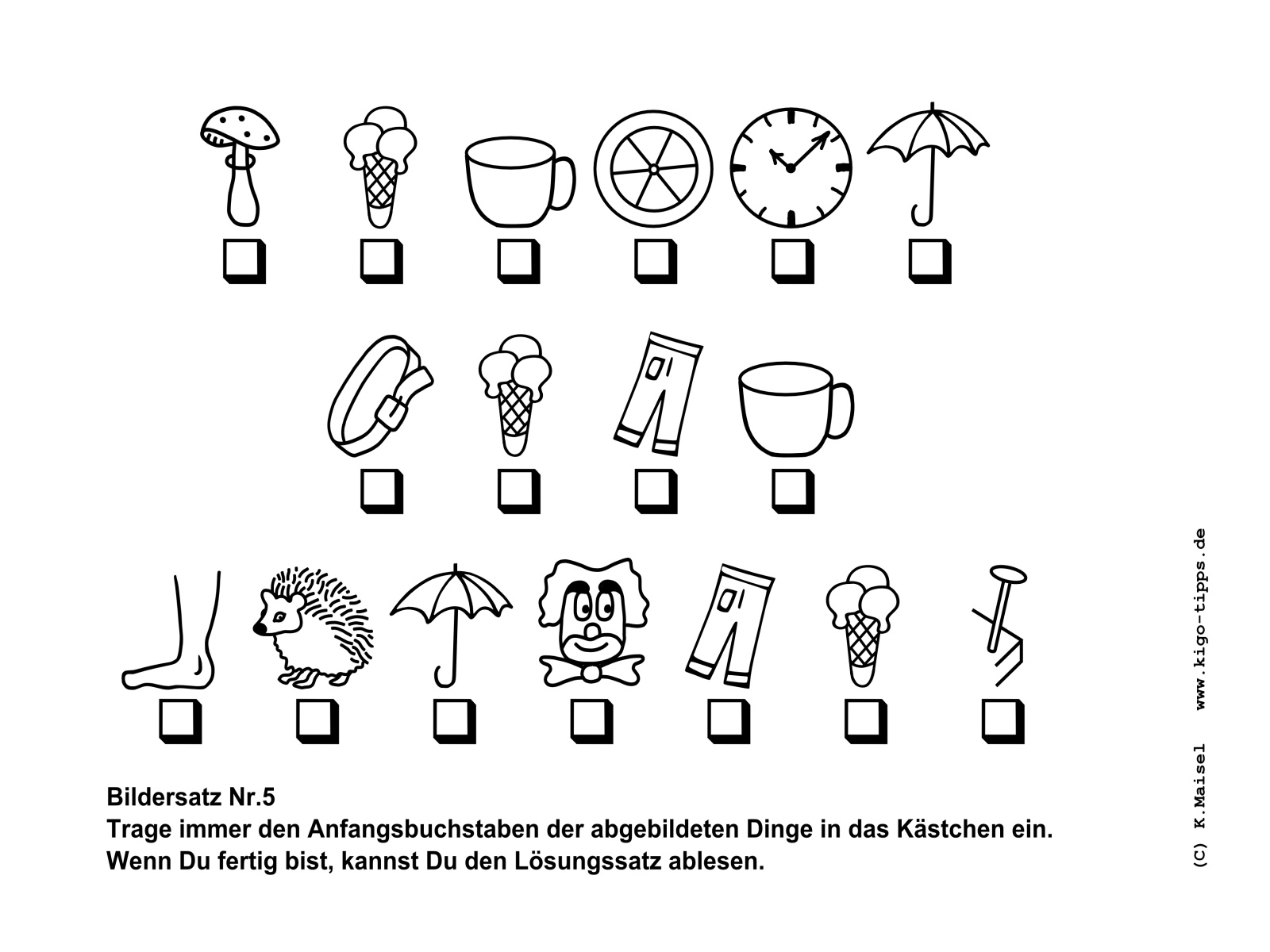 Ein Bildersatz besteht aus den Anfangsbuchstaben der abgebildeten Gegenstände. Sobald der richtige Begriff für den jeweils abgebildeten Gegenstand gefunden ist, kann der Satz Buchstabe für Buchstabe entstehen.