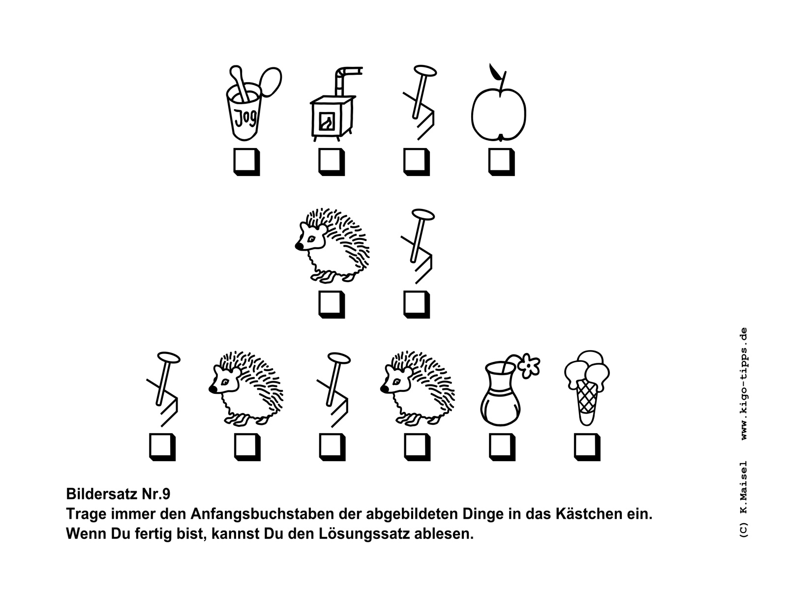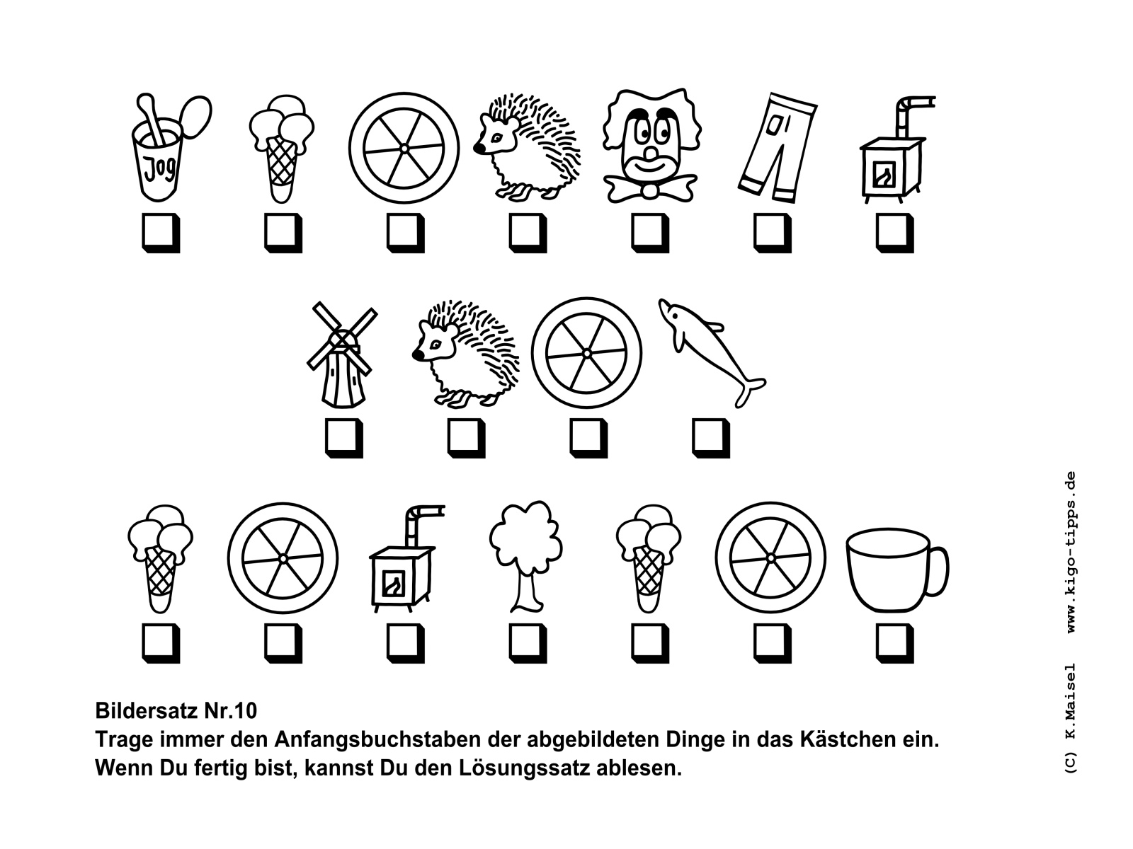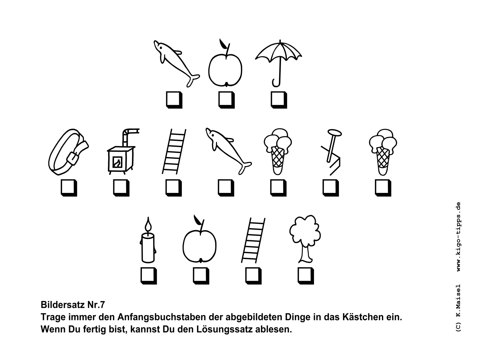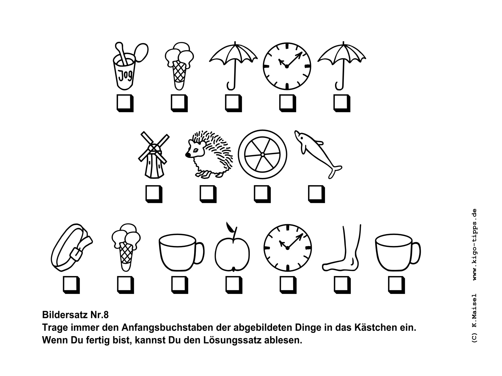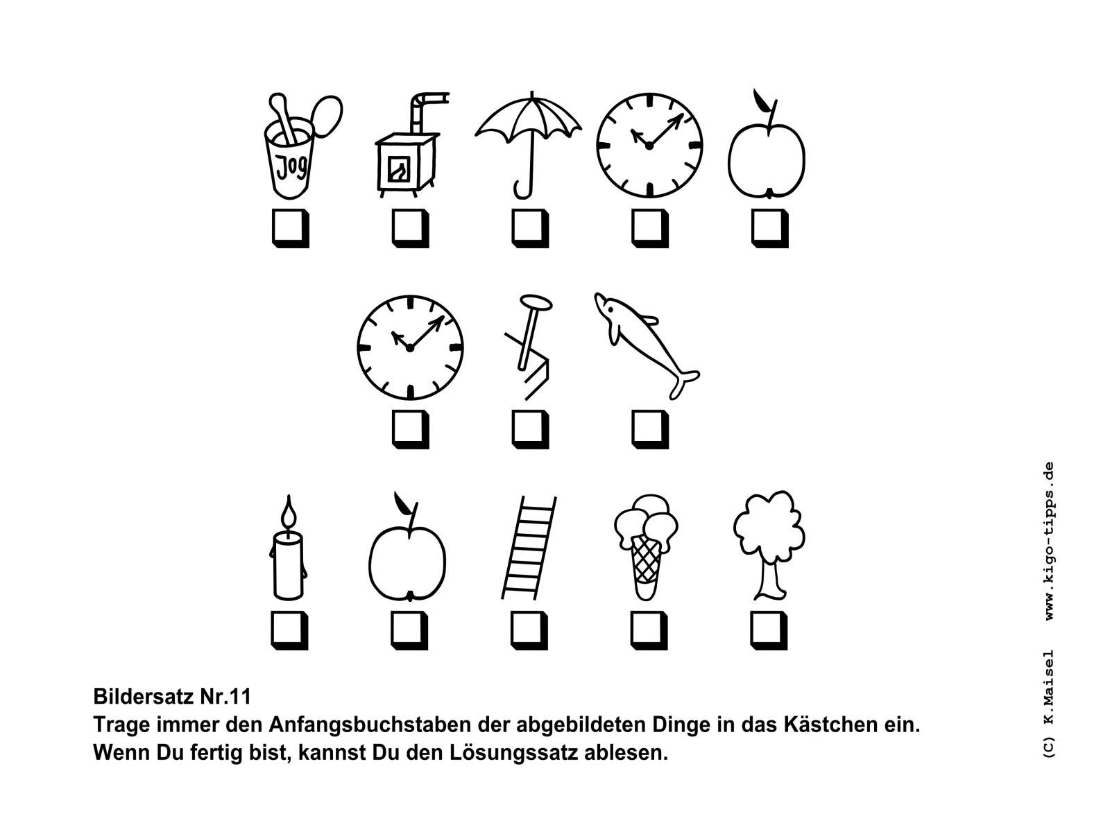 Ein Bildersatz besteht aus den Anfangsbuchstaben der abgebildeten Gegenstände. Sobald der richtige Begriff für den jeweils abgebildeten Gegenstand gefunden ist, kann der Satz Buchstabe für Buchstabe entstehen.