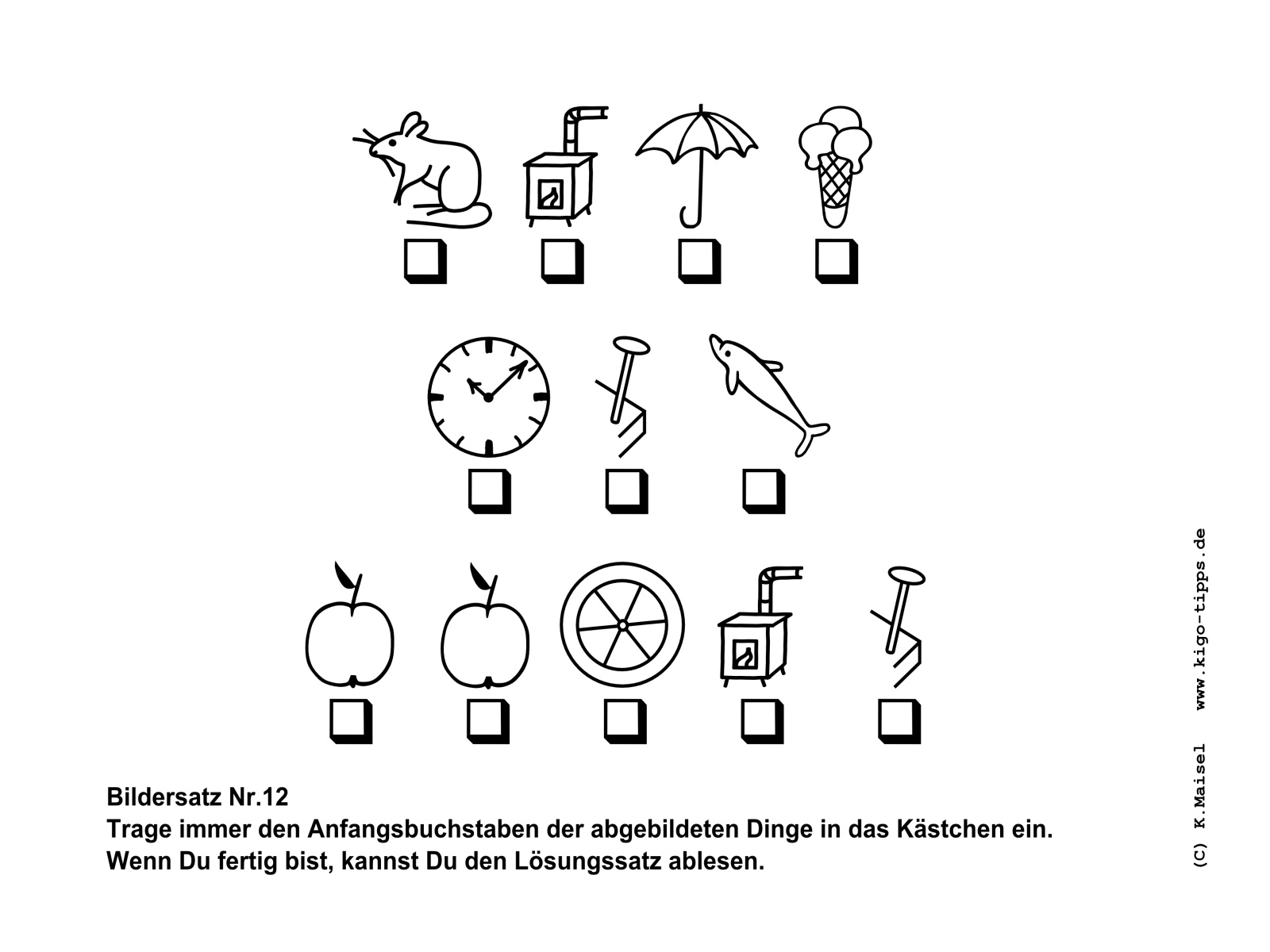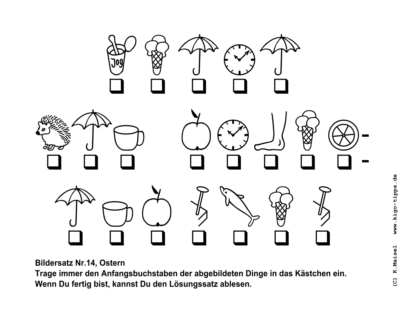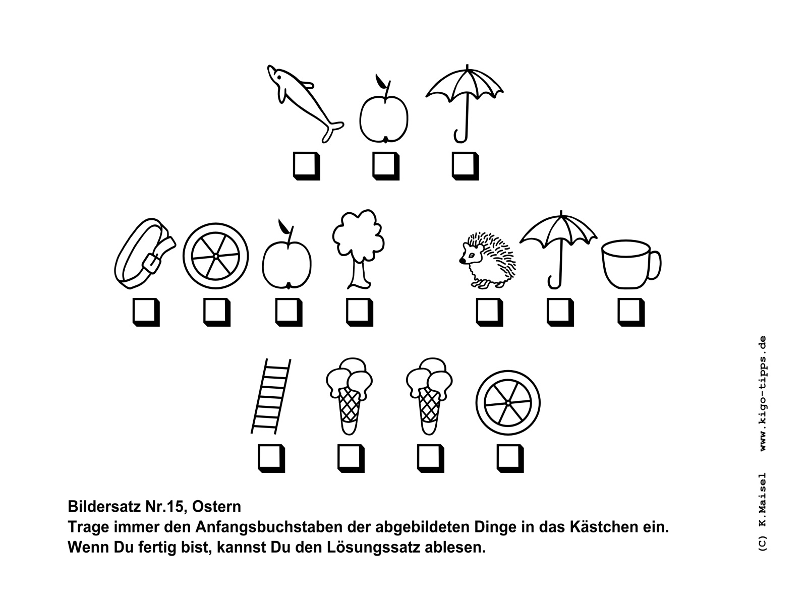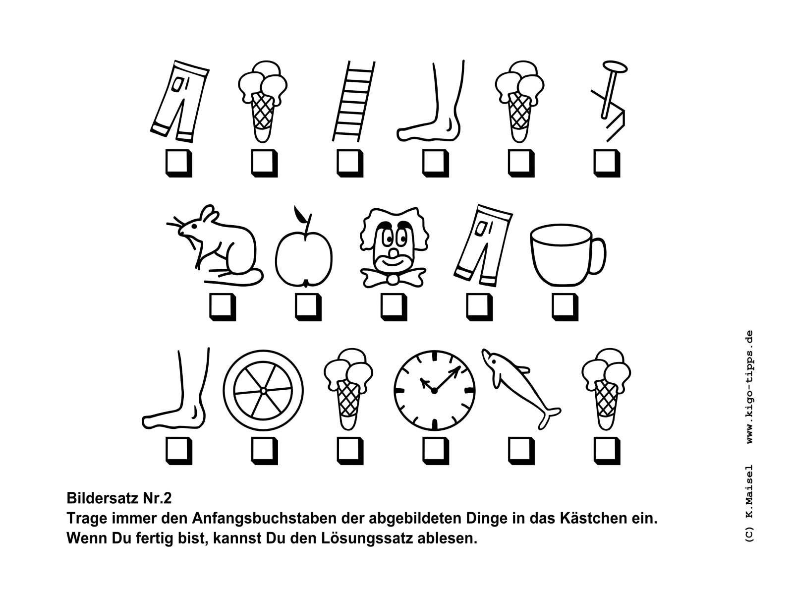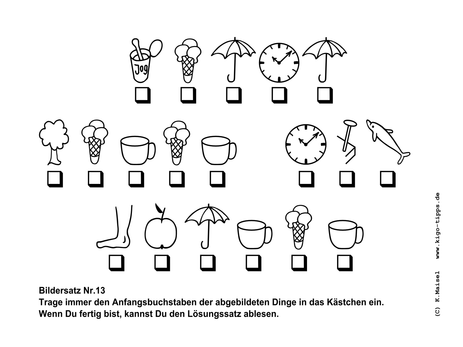 Ein Bildersatz besteht aus den Anfangsbuchstaben der abgebildeten Gegenstände. Sobald der richtige Begriff für den jeweils abgebildeten Gegenstand gefunden ist, kann der Satz Buchstabe für Buchstabe entstehen.