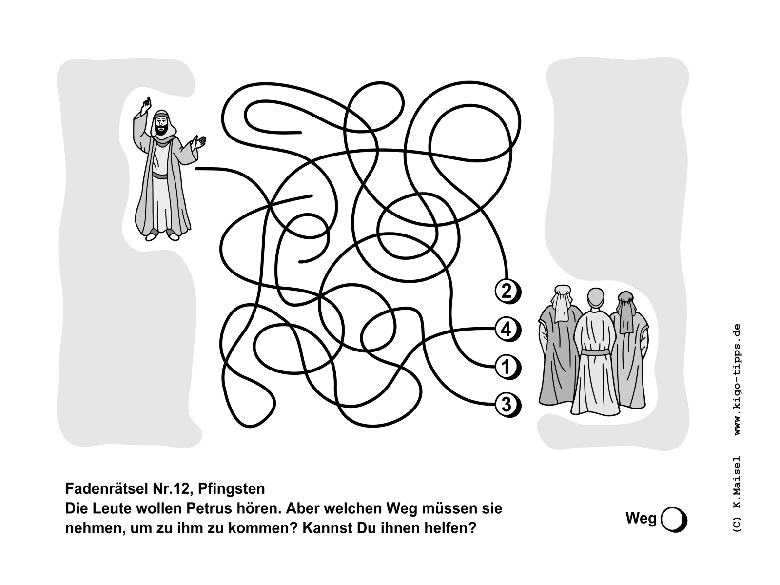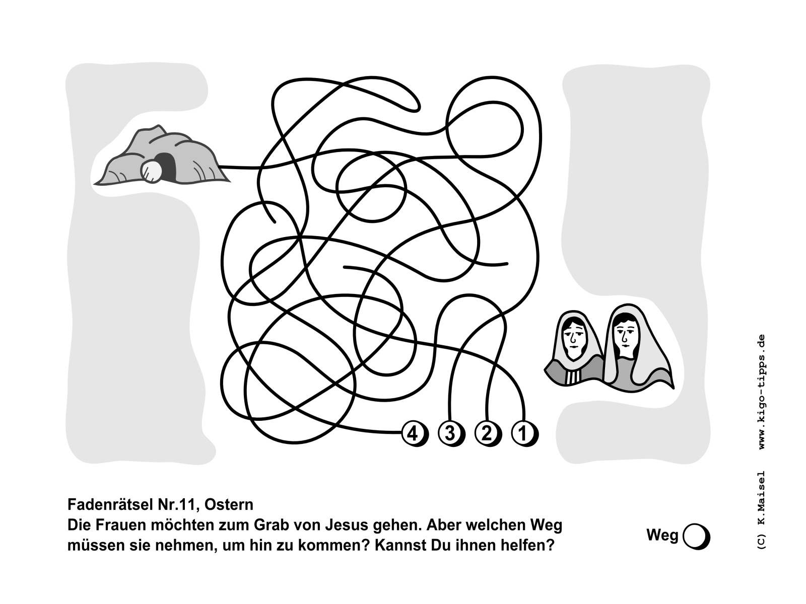 angeschlossenen Faden folgt das Kind konzentriert, bis es auf den am Fadenende angeschlossenen Buchstaben stößt. Das ist der erste Buchstabe des Lösungsworts.