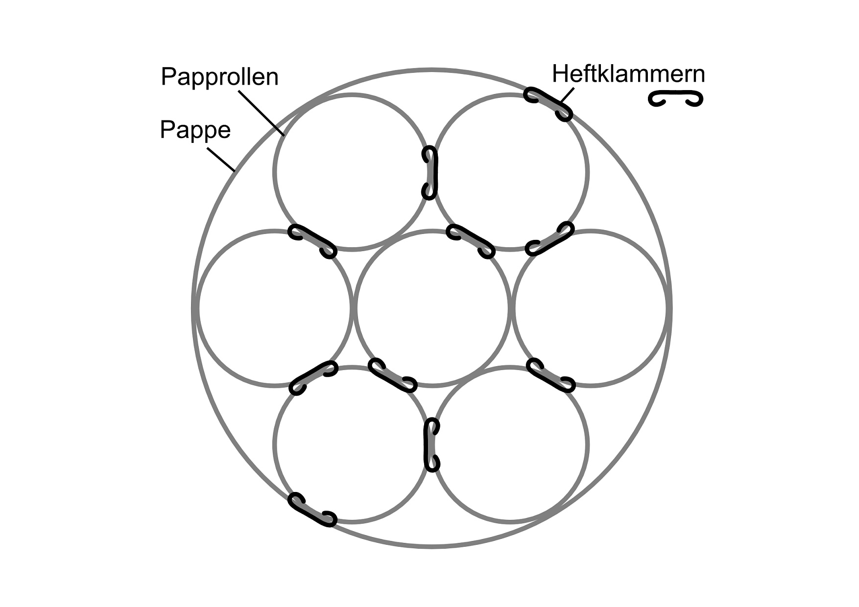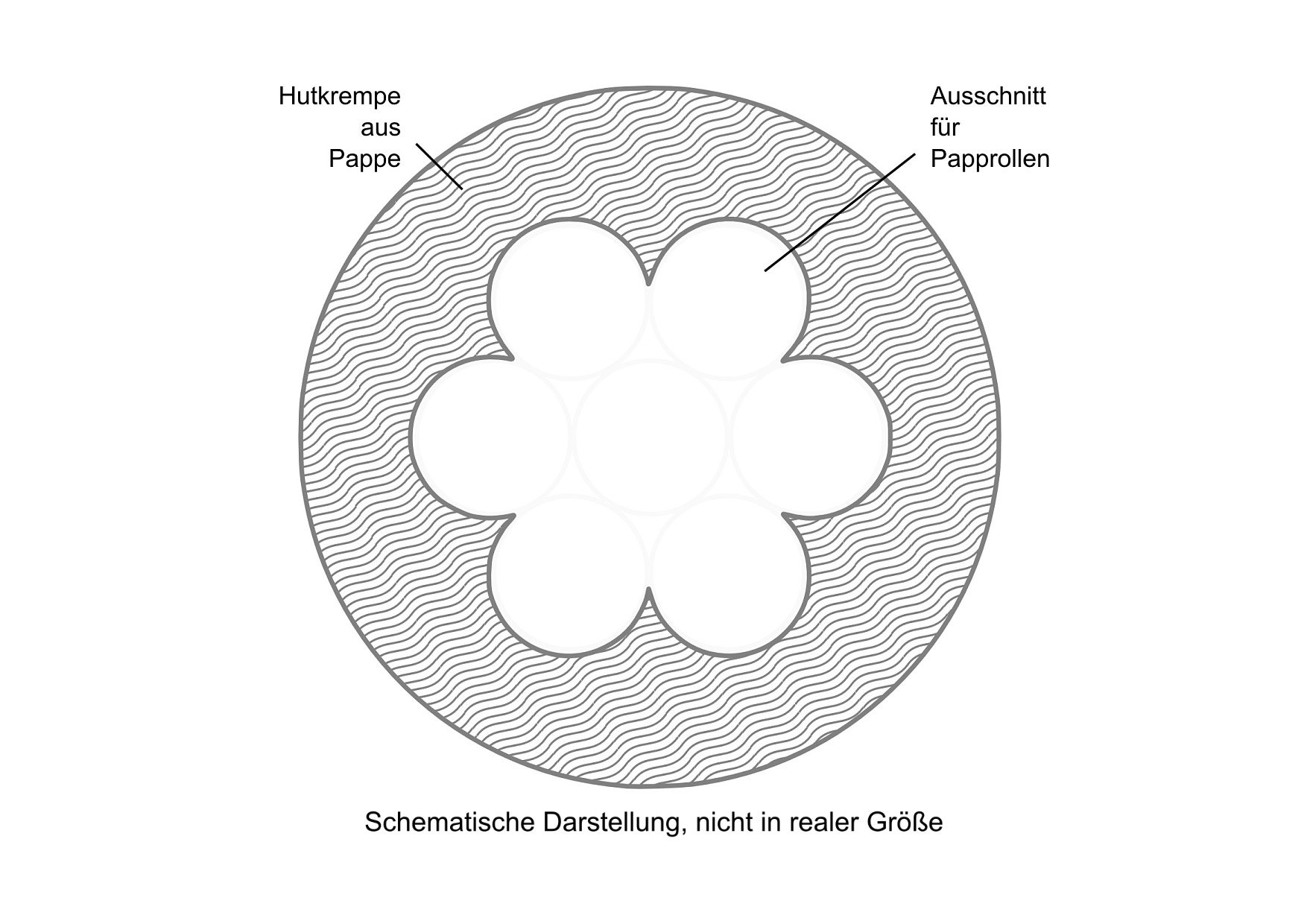Die Rollen bilden das Hut-Innere und werden mit einem Bürohefter zusammengeheftet, ebenso wie der Streifen Pappe als Außenverkleidung (Hutkrone). Das ist schneller und robuster als Klebstoff. Aufgepasst: Die Hutkrone ist offen, hat also kein Dach.