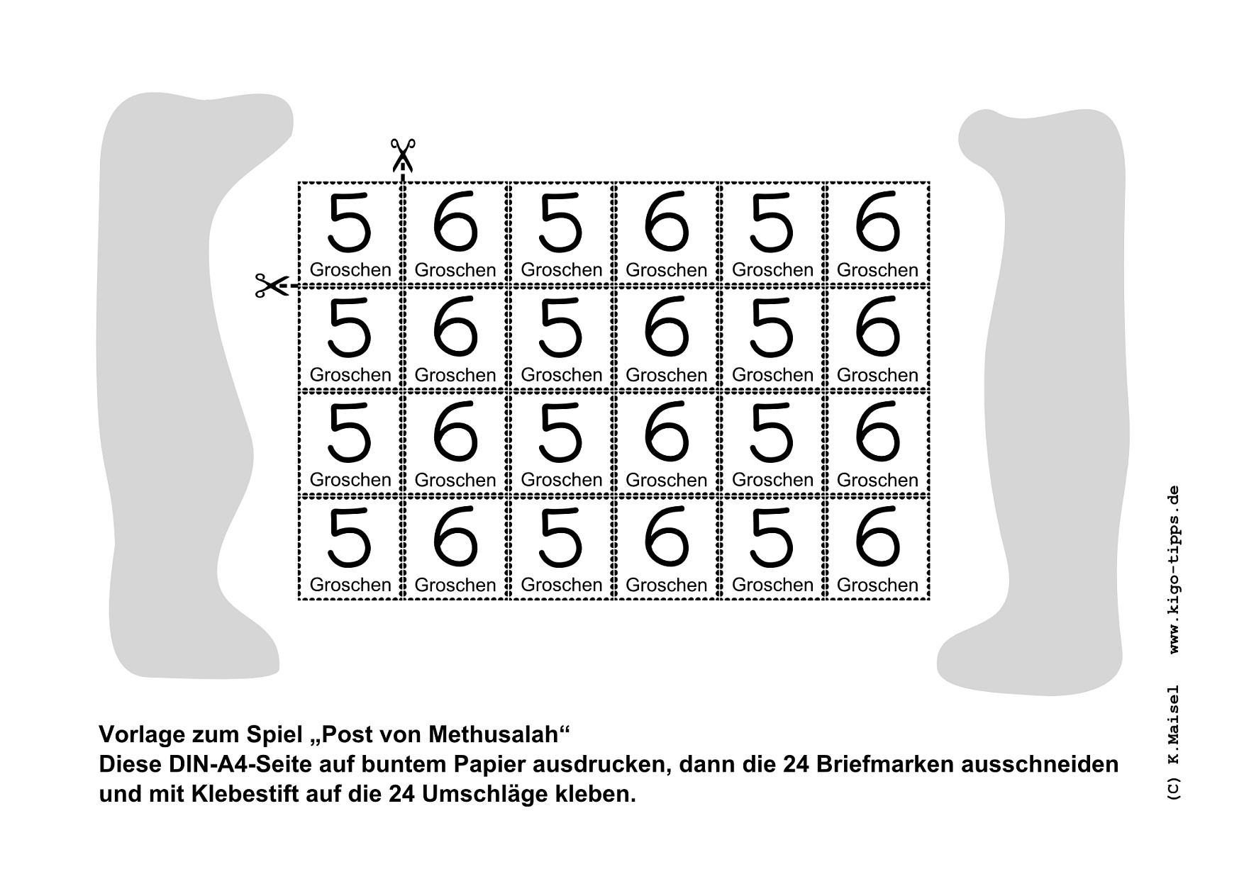 Aus dem buntem Papier schneiden Sie 24 rechteckige „Briefmarken“ aus. Die beschriften Sie mit Filzstift oder Marker jeweils mit entweder 5 Groschen oder 6 Groschen. Danach werden die Marken mit Klebestift abwechselnd auf die Umschläge geklebt.