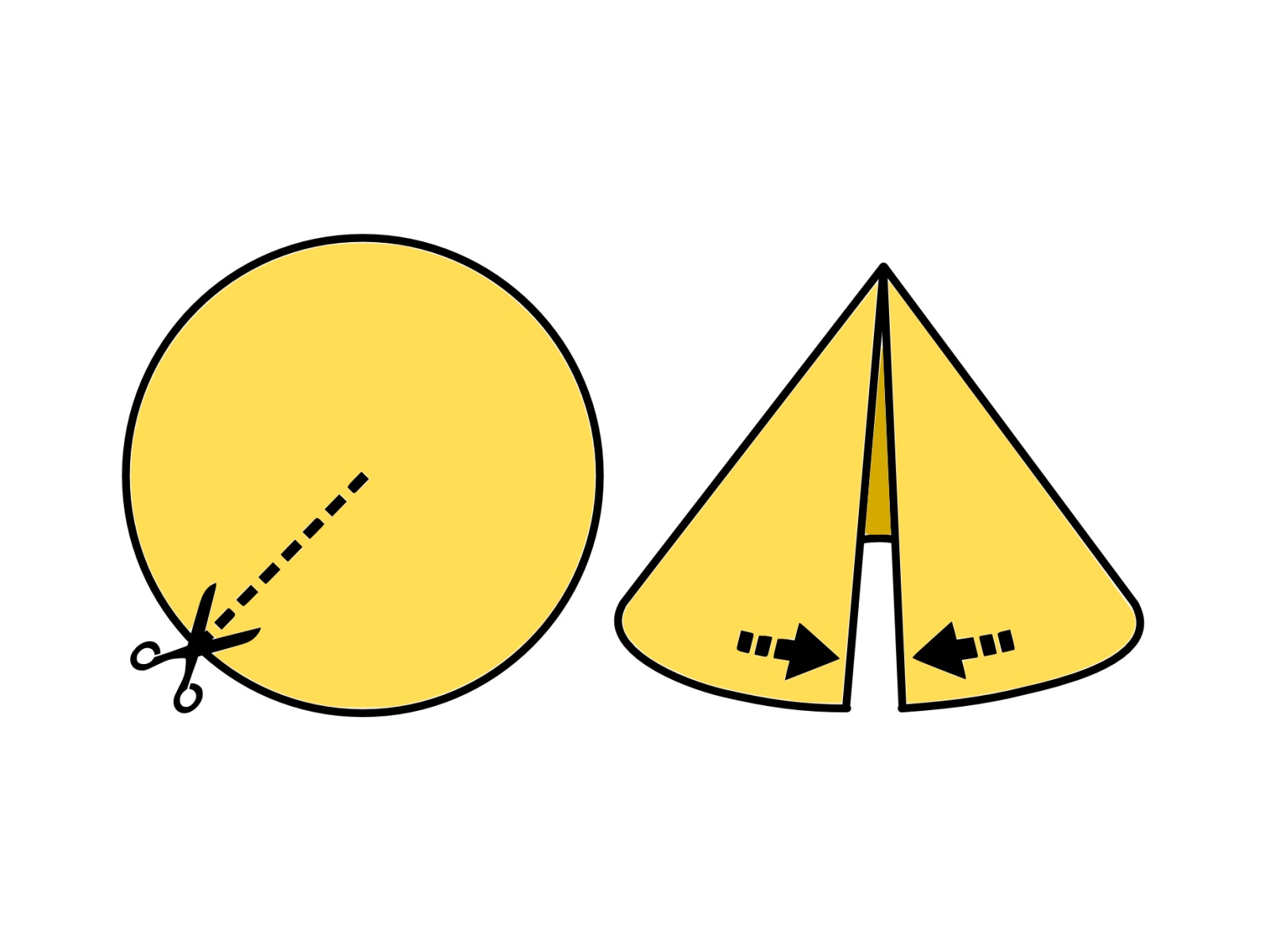 Vier Bogen gelbes Papier DIN A4, jeweils zu Kegeln zusammengeheftet, bilden die Wüstenhügel. Wie diese Kegel gemacht werden? Schneiden Sie einfach einen Kreis aus dem Blatt heraus. Dann machen Sie einen Schnitt bis zur Kreismitte. Jetzt können Sie abschließend den Kreis an der Schnittstelle überlappend zu einem Kegel übereinander schieben und zusammenheften oder kleben.