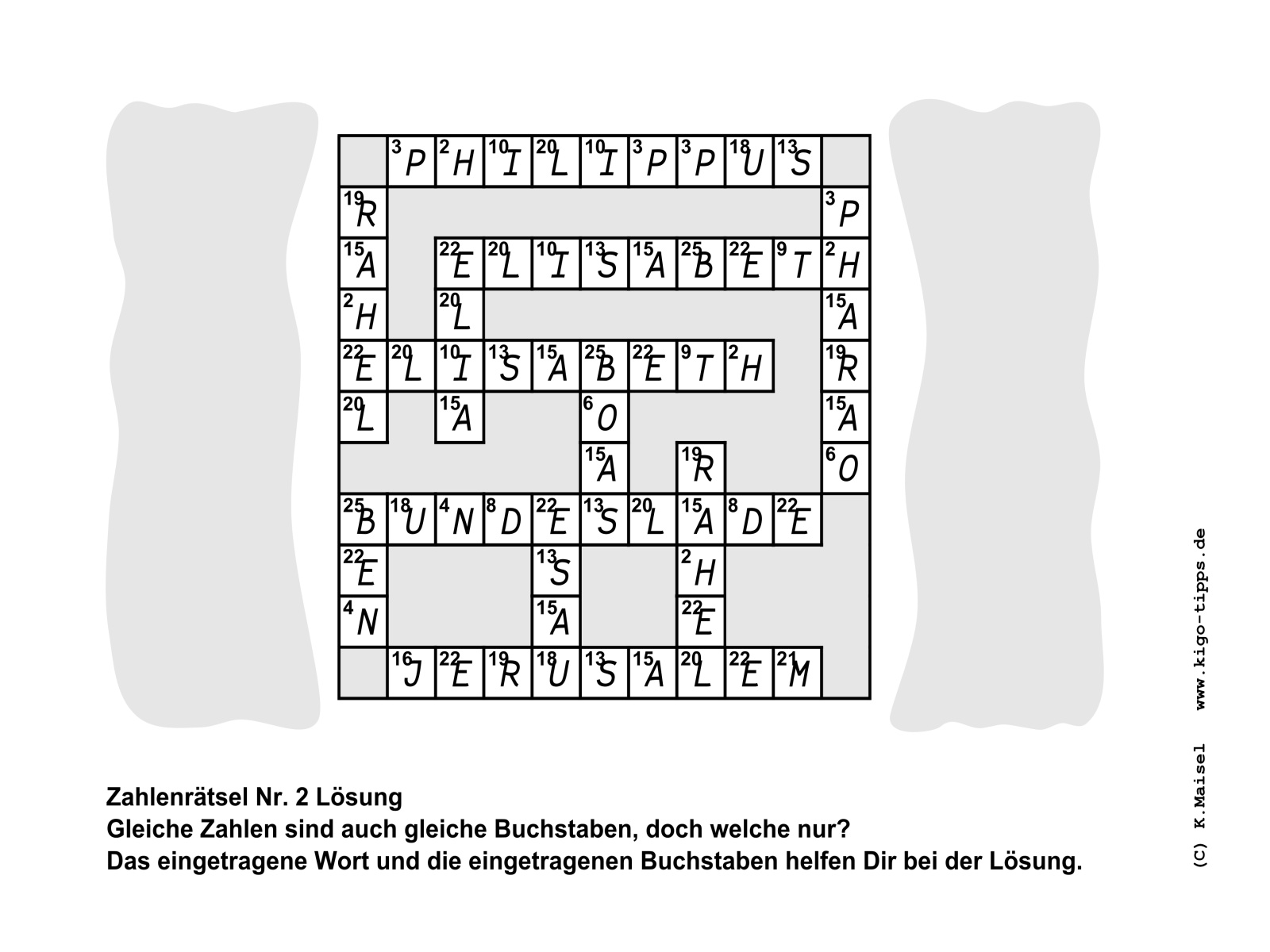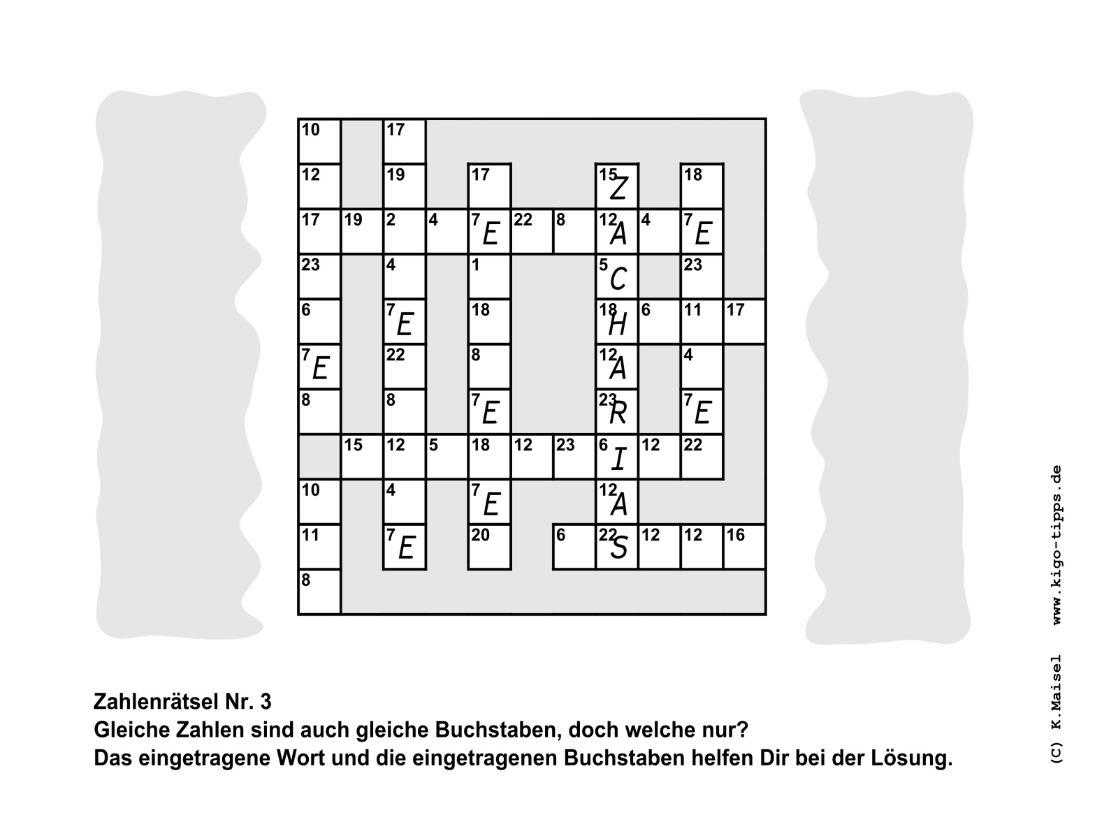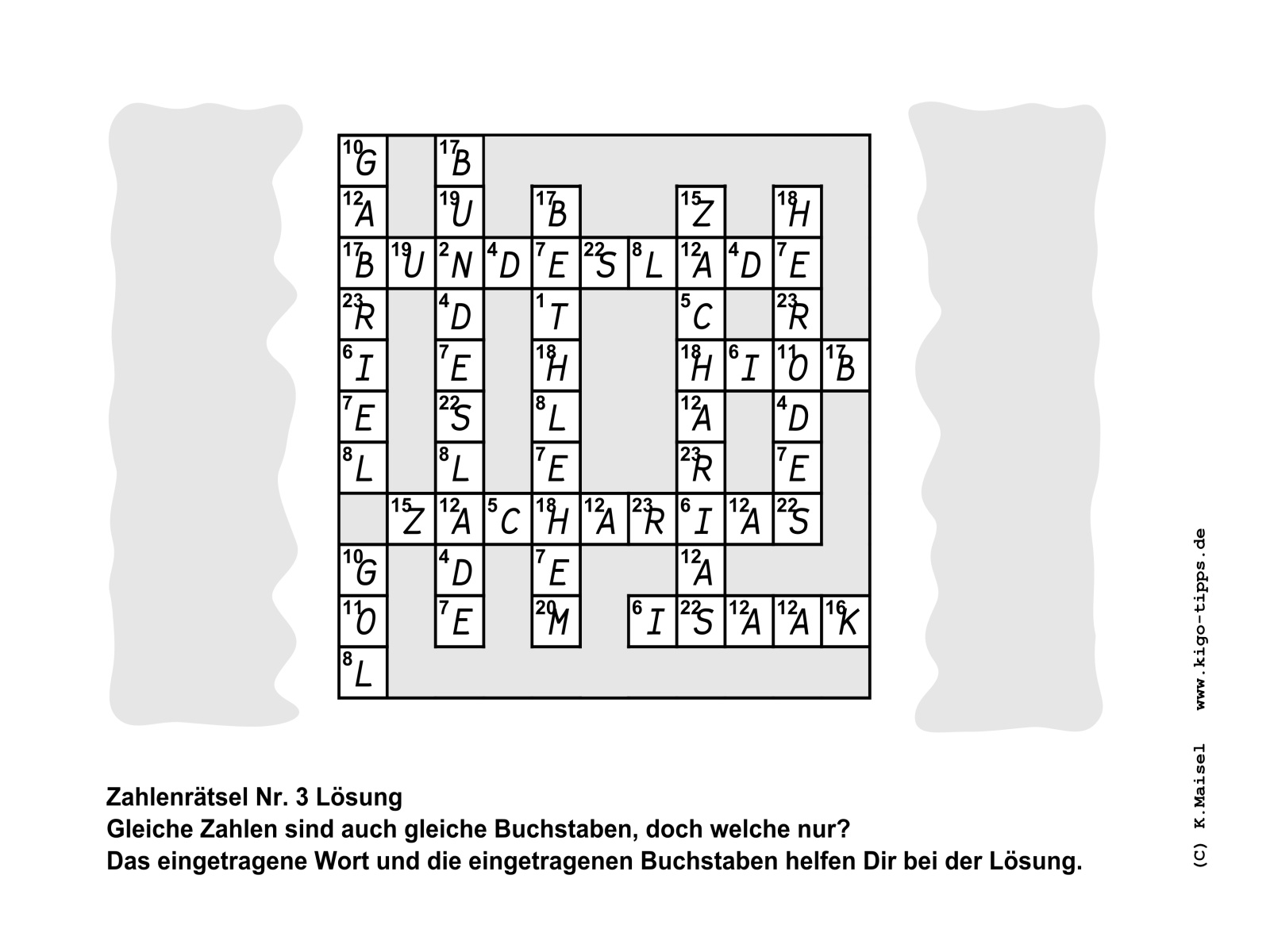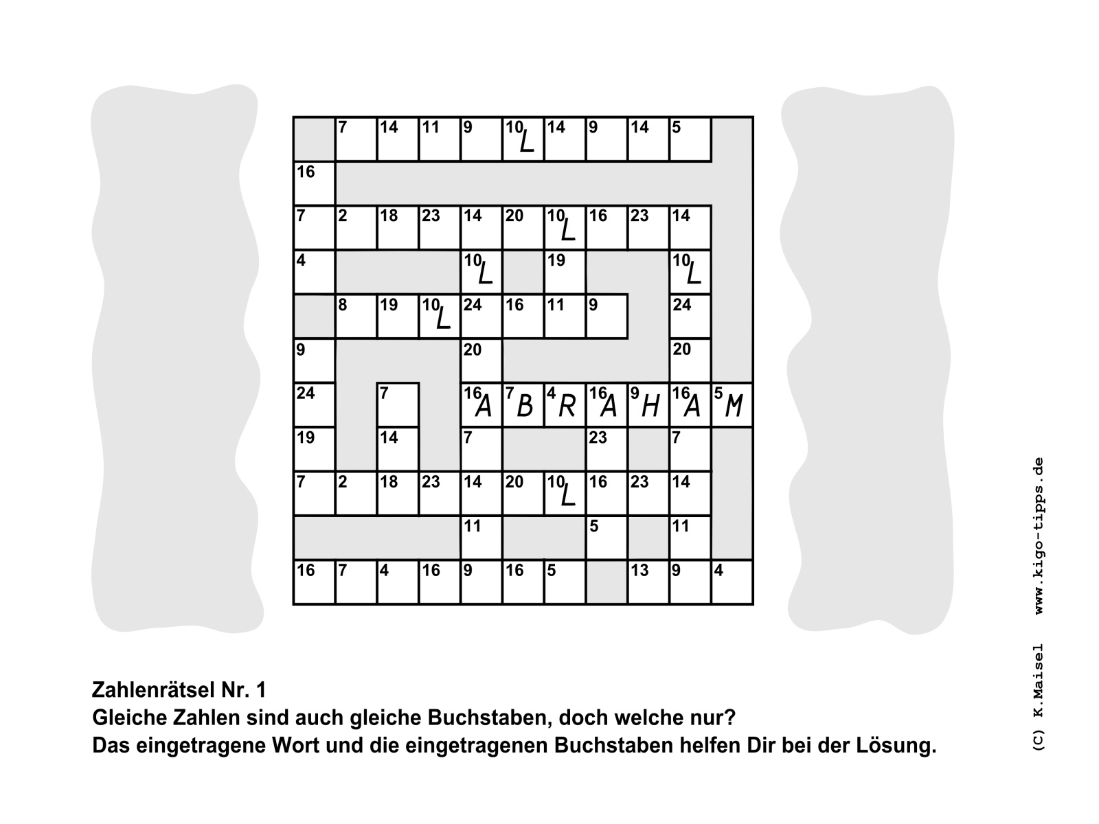 Hier gilt es, die gesuchten Begriffe zu finden, ohne dass es für diese eine Beschreibung gibt. Das funktioniert trotzdem, weil gleiche Zahlen immer für gleiche Buchstaben stehen und schon Buchstaben eingetragen sind.