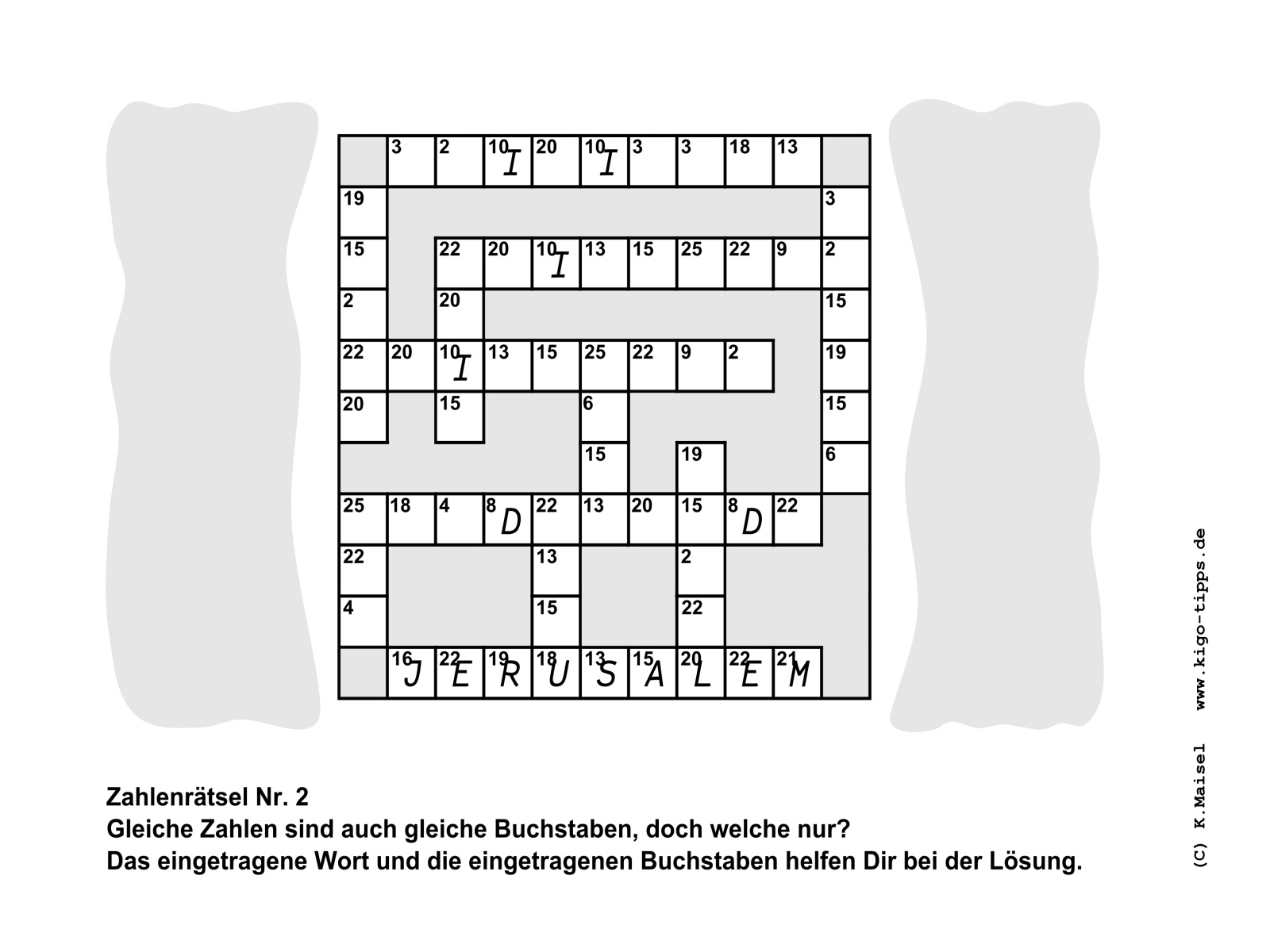 Viele Zahlen und ein paar Buchstaben - was wird das werden? Zahlenrätsel erinnern rein äußerlich an Kreuzworträtsel. Aber eine Beschreibung gesuchter Begriffe fehlt. Dafür gehören zu gleichen Zahlen immer gleiche Buchstaben. So lassen sich Zug um Zug die gesuchten biblischen Begriffe finden.